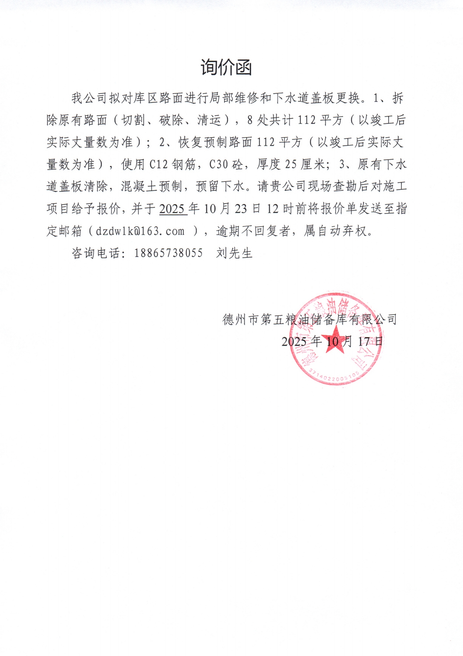 询价公告 | 德州市第五粮油储备库有限公司 库区路面维修和下水道...