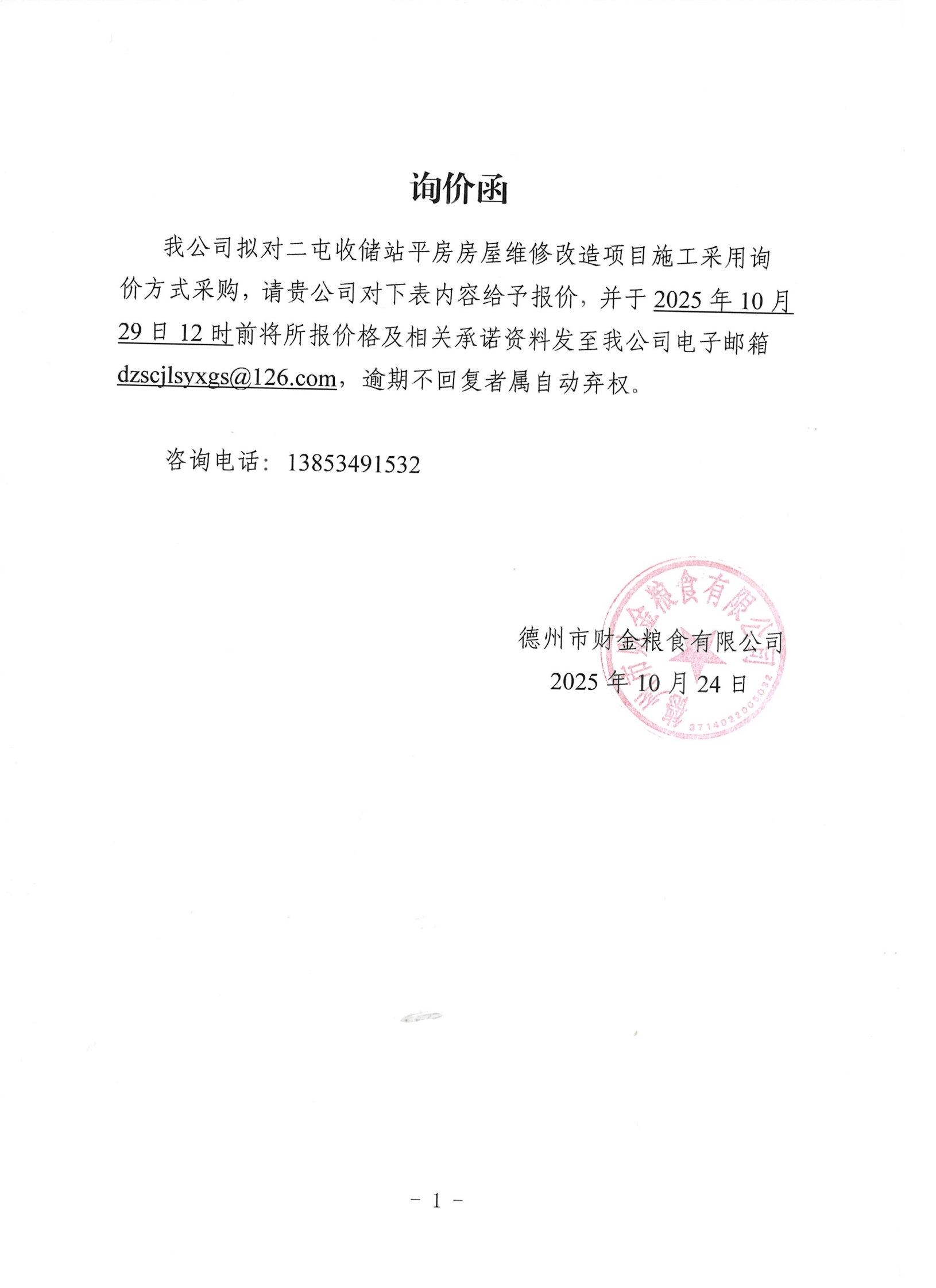 询价公告 | 德州市财金粮食有限公司 二屯收储站房屋维修改造询价公告