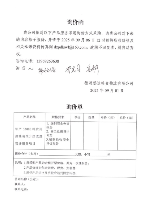 询价公告 |德州鹏达粮食物流有限公司安评服务项目