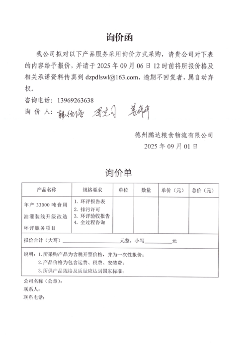 询价公告 |德州鹏达粮食物流有限公司环评服务项目