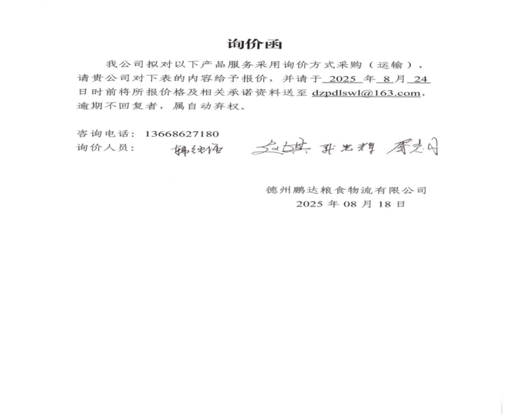 询价公告 |德州鹏达粮食物流有限公司平原分公司巧固架运输服务项目